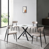 Introducing our set of four upholstered dining chairs, where comfort intertwines with artistry. Each chair has been thoughtfully crafted to invite joy into your home, featuring a sturdy metal frame that showcases a sleek matte black finish—adding a touch of contemporary elegance to any space.