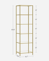 This exquisite glass shelf in a radiant gold finish effortlessly enhances any space with its modern elegance. Measuring at a versatile 11.8”D x 15.7”W x 69.8”H, this bookcase is designed to fit seamlessly into narrow corners—be it between your kitchen counter and refrigerator, or nestled in your bathroom.