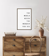 Transform your living space into a sanctuary of inspiration with our enchanting framed canvas, "The World Needs the Wonder You See." Radiating a sense of tranquility and appreciation for the beauty around us, this exquisite piece is thoughtfully encased in a refined pine tree frame, elevating its artistic allure.